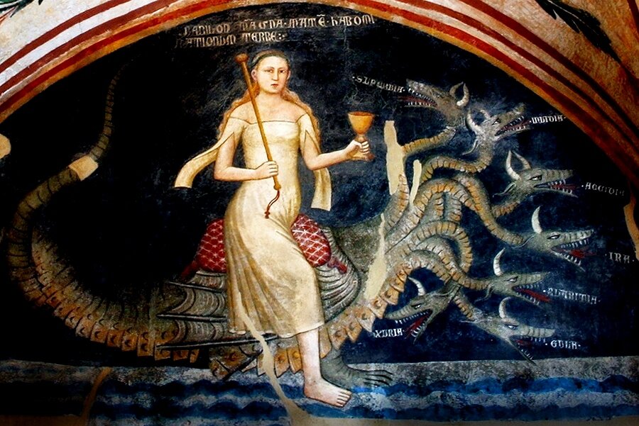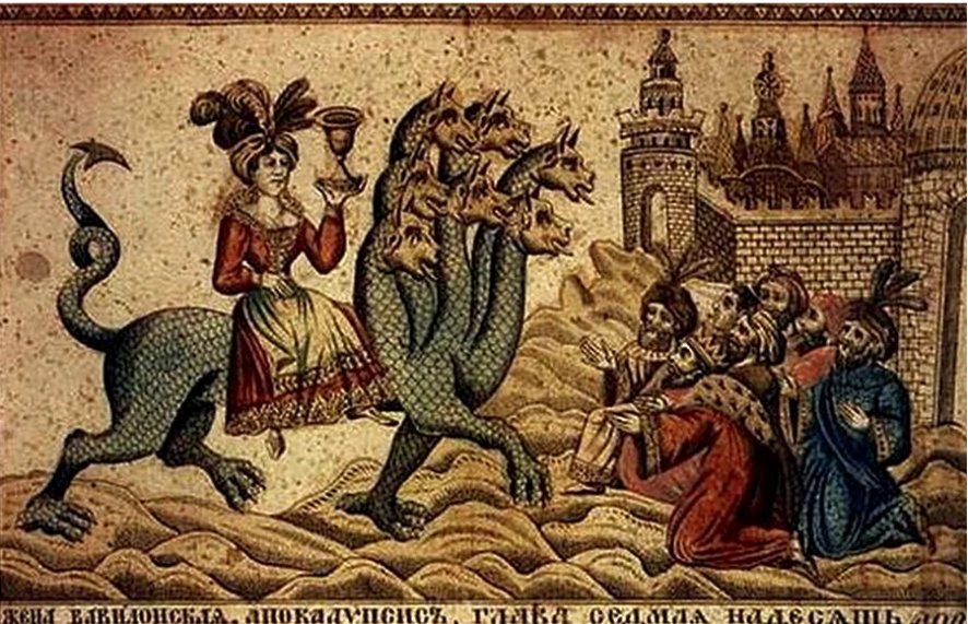 увидел жену, сидящую на звере багряном, преисполненном именами богохульными, с семью головами и десятью рогами. И жена облечена была в порфиру и багряницу, украшена золотом, драгоценными камнями и жемчугом, и держала золотую чашу в руке своей, наполненную мерзостями и нечистотою блудодейства её; и на челе её написано имя: тайна, Вавилон великий, мать блудницам и мерзостям земным. Я видел, что жена упоена была кровью святых и кровью свидетелей Иисусовых, и видя её, дивился удивлением великим. (Откр. 17:3-6)