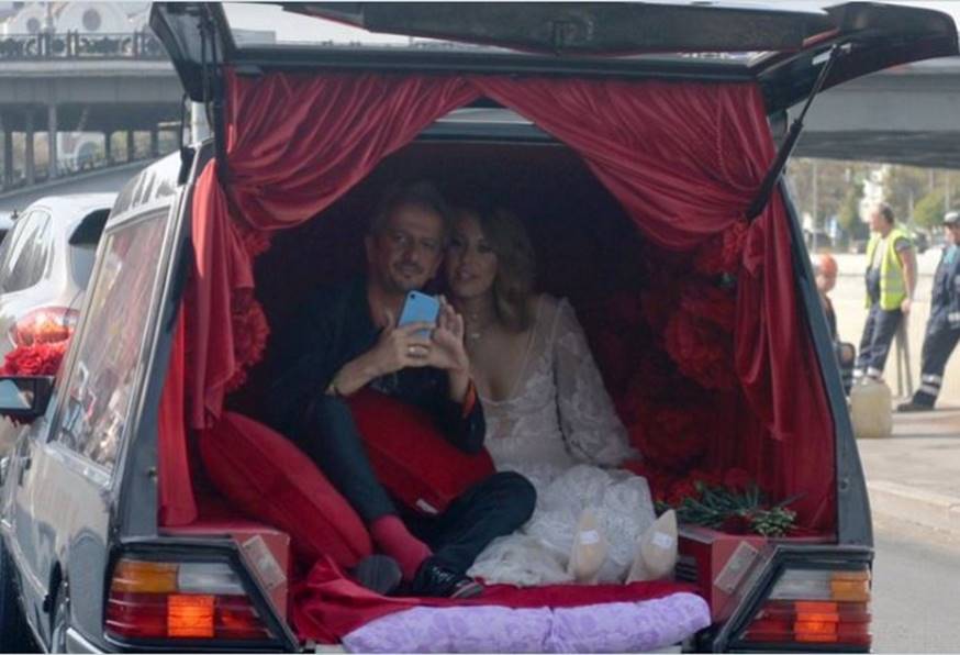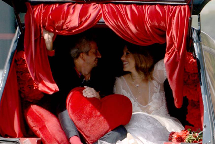 К ЗАГСу Собчак и Богомолов приехали в катафалке с надписью "Только смерть разлучит нас". Причем они лежали на местах, где обычно стоит гроб с покойником. И уехали также в последний путь в труповозке. Туда им и дорога.