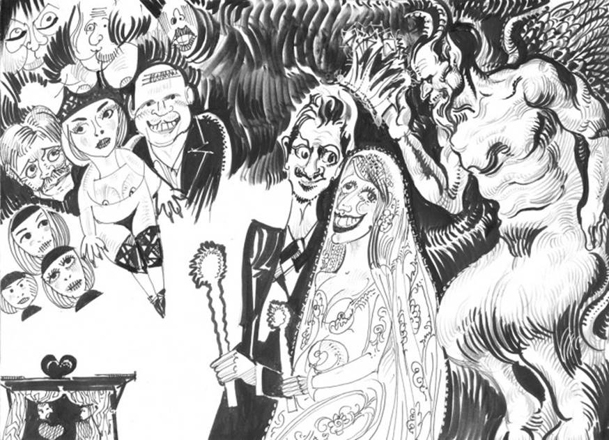 Часть первая. Жених и невеста едут венчаться в храм, лежа в катафалке. Это явно взято из масонства. Мол, мы умираем для старой жизни. Мы, прежде чем обвенчаться друг с другом, мы венчаемся со Смертью. Правда, картина была незаконченной, надо было ещё на крышу катафалка положить скелет в саване с косою в костлявых руках. А на борту написать не «Нас разлучит только Смерть!», а «Эх, прокачу!» . . .